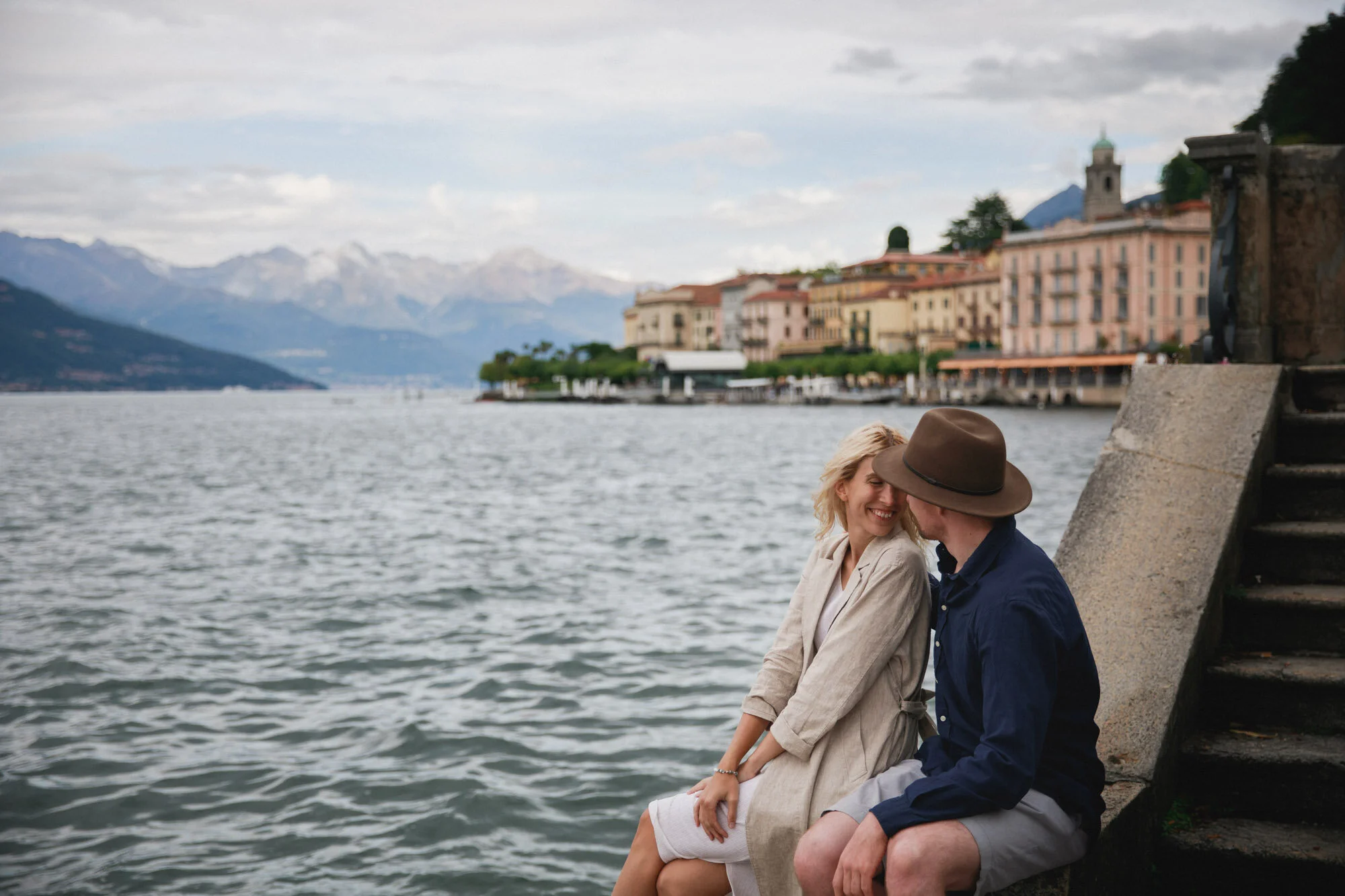 We got the 8-minute ferry across to Bellagio. From the ferry, we turned right and walked through the park on the waterfront. We found a photogenic staircase leading down to the water with a good viewpoint of Bellagio Town.