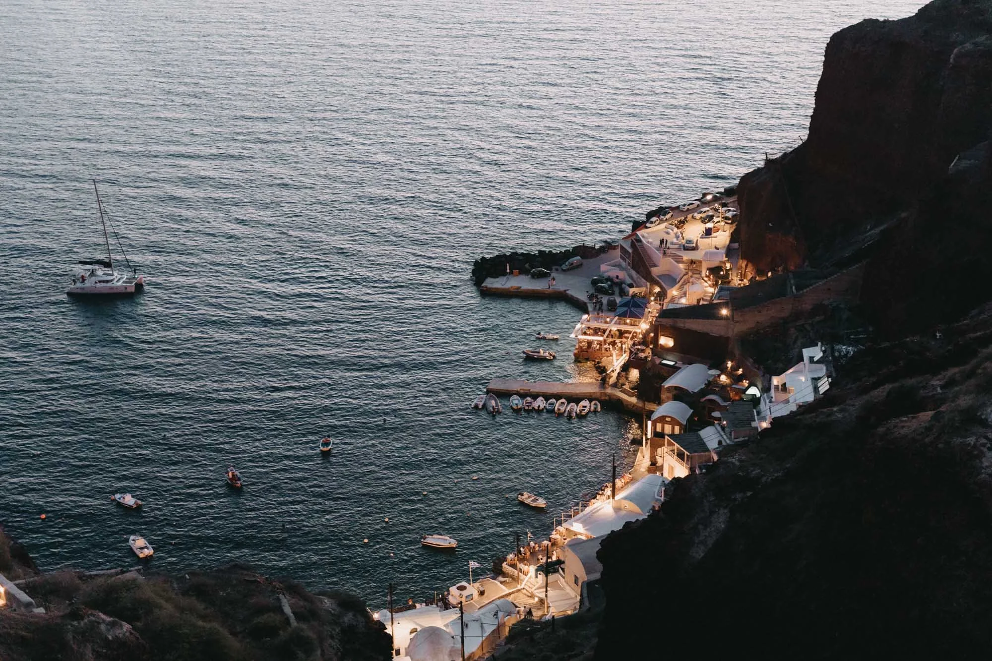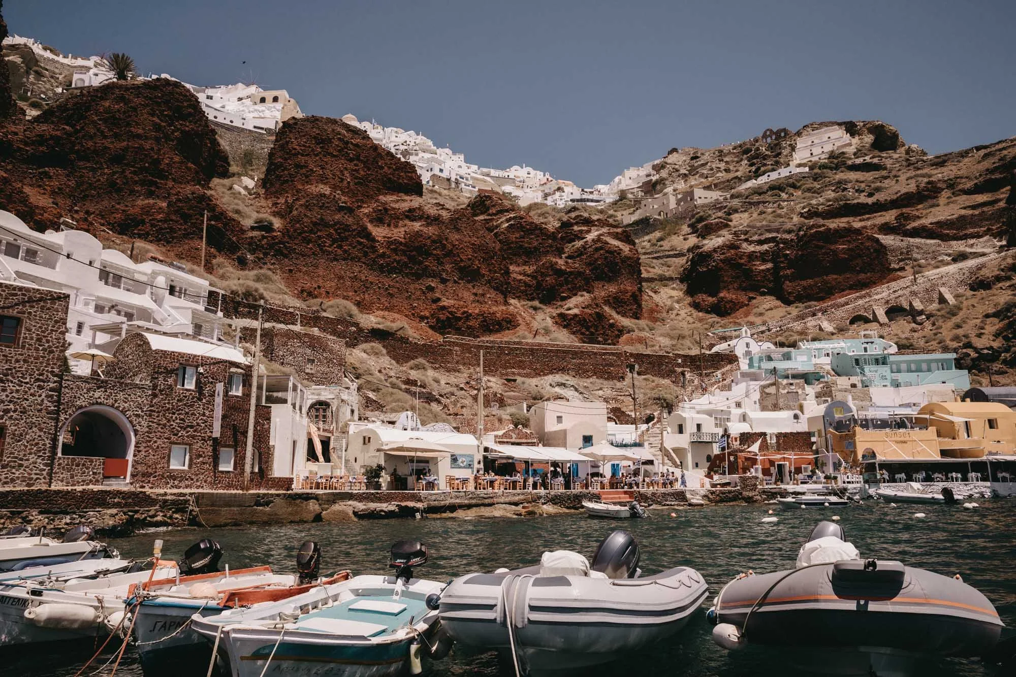 From Amoudi Bay there is an epic view up to Oia with its white washed buildings and red cliffs. There are a few restaurants on the water here. The path continues South around the coastline where there are some swimming spots.